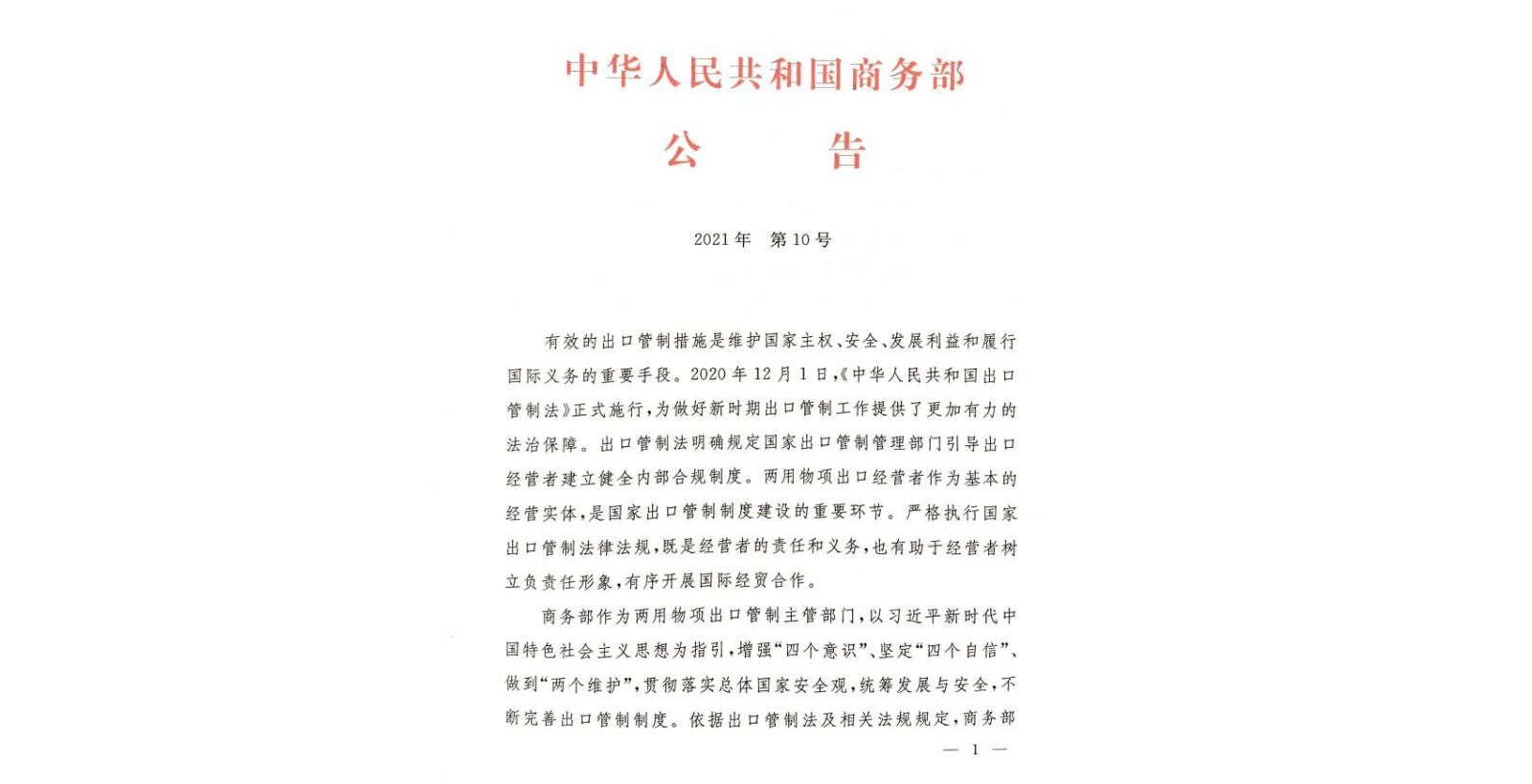 商務(wù)部2021年4月發(fā)布《商務(wù)部關(guān)于兩用物項(xiàng)出口經(jīng)營(yíng)者建立出口管制內(nèi)部合規(guī)機(jī)制的指導(dǎo)意見》及《兩用物項(xiàng)出口管制內(nèi)部合規(guī)指…